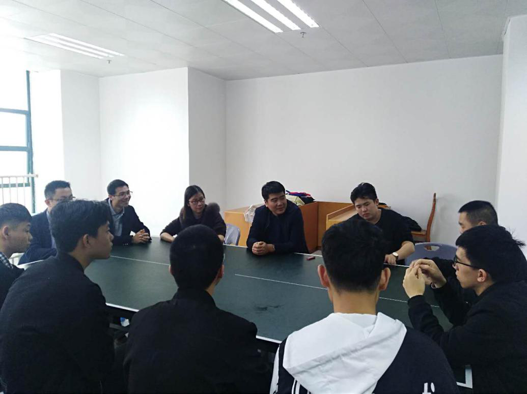 图1 图2指导老师到揭阳鹏轩电子科技有限公司与实习生座谈