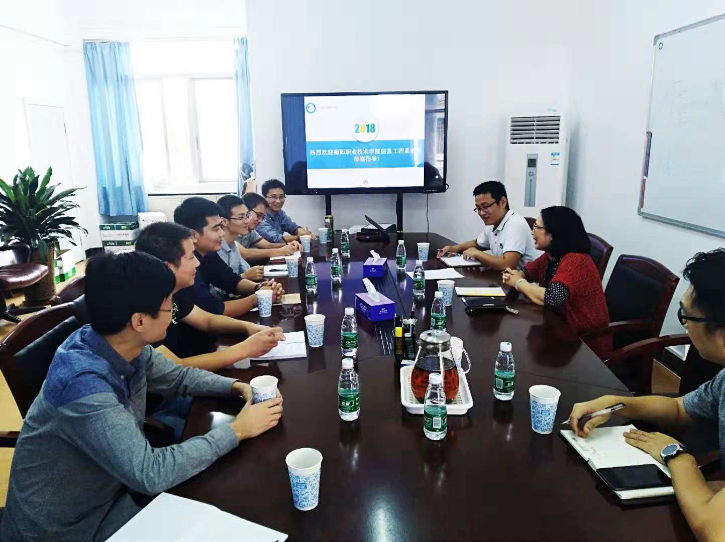 赵副院长介绍了信工学院的机构设置、师资力量、专业建设、产教融合、学生参赛等基本情况。在专业建设方面,人工智能专业群获得了市级立项,并形成了校级平台课、院级平台课、专业平台课三位一体的课程体系,获得省重点专业3个、省级特色专业1个。在产教融合方面与100多家企业建立了长期的校企合作关系,“厂中校”、“现代学徒制”、“众创空间”等办学模式成效显著。积极鼓励学生参加各类比赛,学生技能竞赛普及率90%以上。物联网专业万主任详细介绍了物联网专业品牌专业建设以及人工智能专业群建设情况,软件专业徐教授详细介绍了软件专业社会服务等工作情况。